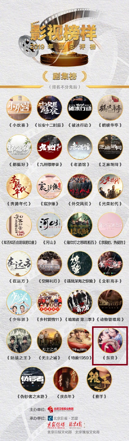 12月9日8时至12月16日24时,“影视榜样·2019年度总评榜”进行网络票选,唐德影视联合出品的电视剧《东宫》入围剧集类网络票选名单。